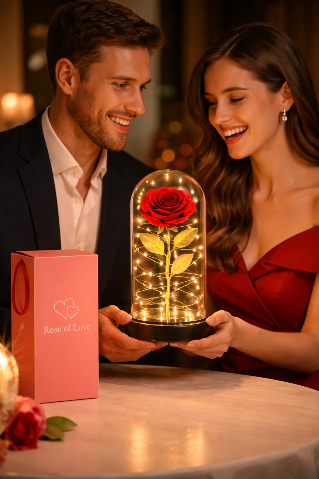 Róża osadzona jest na stylowej podstawie, a ciepłe światło podkreśla jej piękno, tworząc nastrojową atmosferę. Całość zapakowana w eleganckie pudełko prezentowe – gotowa do wręczenia.